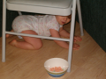 Callie discovers a new place to "hide" her goldfish and Apple JacksCallie is learning to eat with utensils.Callie attempts to climbs through the chairCallie attempts to climbs through the chair