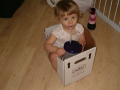 | Callie drinks water in her box. Water, diaper, what more could you ask for in a box? | She really did climb in there on her own, we did not put her in there. | Callie found a cushion to watch TV from | Callie falls asleep in her hi-chair |