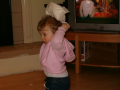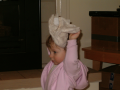 | Callie playing with computer chords | Callie puts a diaper hat on. | Callie tries to put her diaper hat back on (the diaper is a clean one) | Tries to wear the diaper again |